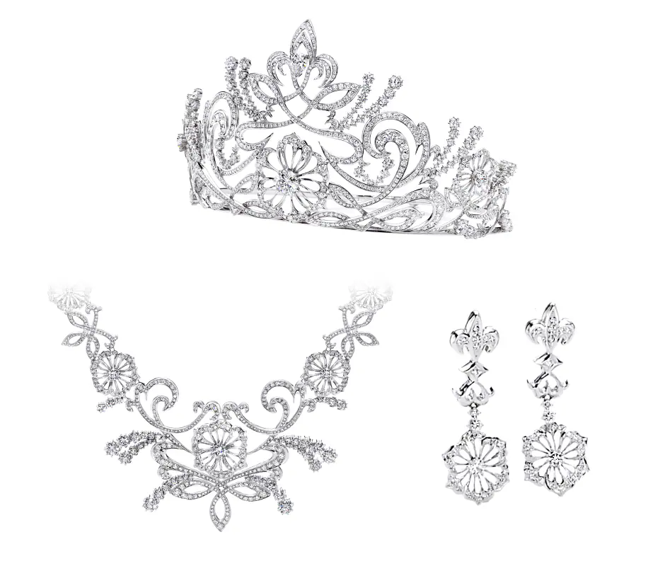 在歐洲,貴族們常以自己心目中的烏托邦打造庭園。 「Shangri-la」皇冠套組,便是以此為靈感,描繪在夢幻庭園中,在命運牽引下相遇的戀人們的情景。以一條不間斷的線條象徵著命運的羈絆,鑲嵌總重 104.996 克拉的鑽石,為倆人的相遇獻上最璀璨的祝福。