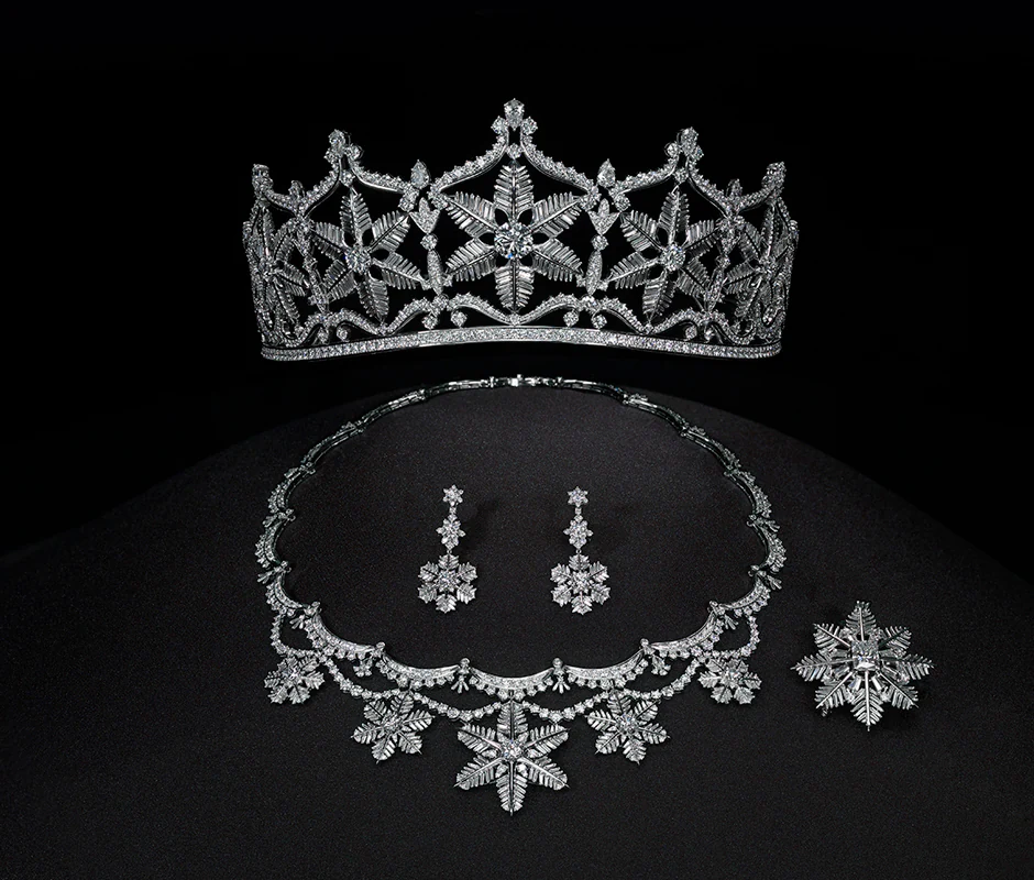 新娘由總克拉數約 200 克拉、相當於市價約 30 億日圓的鑽石所點綴,展現出王妃般高貴優雅的氣質。在皇冠與項鍊的中心點,鑲嵌著極為稀有的大顆黃鑽。即使整體設計華麗奢華,皇冠中央的心形鑽石仍為作品增添了一抹女性特有的柔美與可愛氣息。